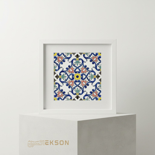 تابلو کاشی برند اکسون، اثری نفیس از هنر سنتی ایرانی با طرح هندسی متقارن هشتپر فیروزهای، حاشیههای اسلیمی زرد و قرمز و لعاب براق زنده است که در قاب چوبی شیک عرضه میشود.